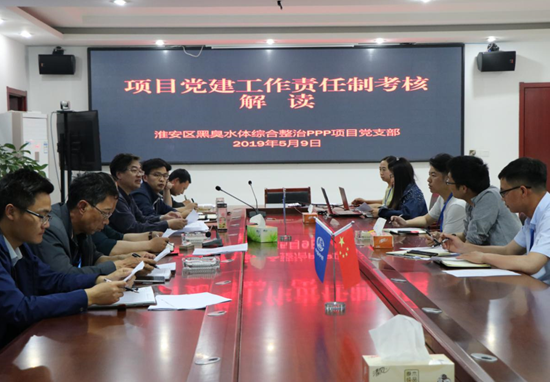 5月9日,淮安區黑臭水體綜合整治PPP項目黨支部解讀“黨 建工作責任制考核”,開啟項目“周培訓”第一課,項目黨支部書記授課。