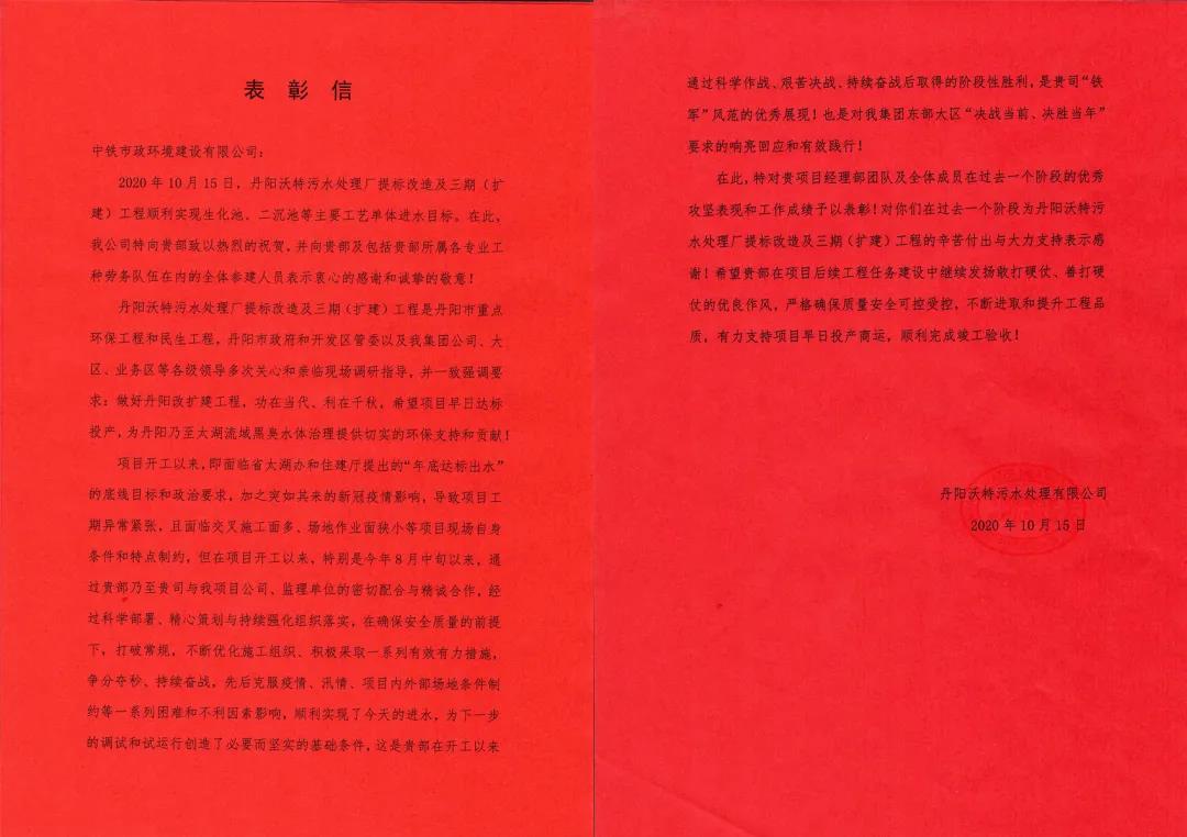 公司收到丹陽(yáng)沃特污水處理有限公司表彰信...