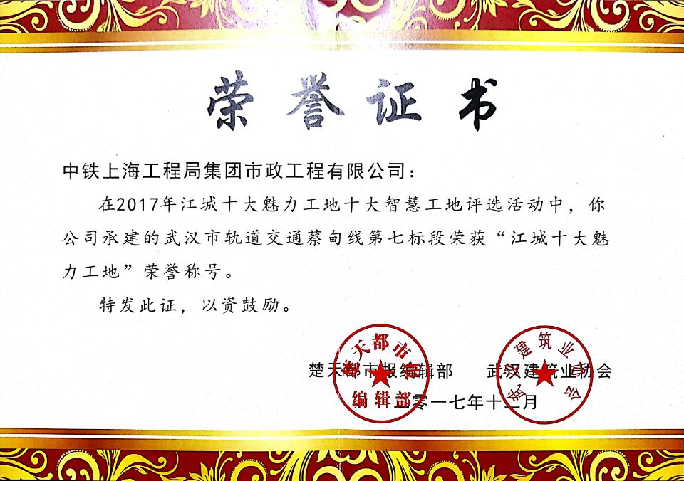 1月7日,江城“十大魅力工地”“十大智慧工地”頒獎儀式在武漢市楚天傳媒大廈楚天會堂隆重舉行。由市政公司承建的武漢市軌道交通蔡甸線第七標段項目喜獲“十大魅力工地”稱號,這也是中鐵上海局自進入武漢市場以來首次獲得該項榮譽。...
