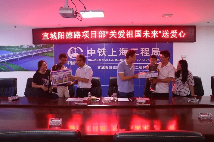 項(xiàng)目兩位女員工與丈夫不在一個(gè)項(xiàng)目部,獨(dú)自帶小孩工作生活,工程項(xiàng)目繁忙,家庭也不能團(tuán)聚,為使員工子女過上一個(gè)有意義的兒童節(jié),把項(xiàng)目“職工小家”建設(shè)工作落到實(shí)處,項(xiàng)目部特意為小朋友挑選適合的禮物。6月1日,項(xiàng)目黨支部書記賈述榮代表項(xiàng)目部向2名小朋友送去節(jié)日禮物,在為小朋友們送去祝福的同時(shí),也向員工的辛勤工作表示了衷心感謝,并特意給她們放假半天,帶孩子走出項(xiàng)目部開展親子互動(dòng)活動(dòng),項(xiàng)目青年員工與2名小朋友進(jìn)行了互動(dòng)游戲。
