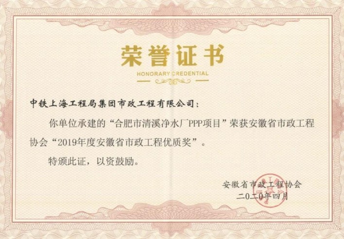 近日,安徽省市政協會傳來喜訊,公司承建的合肥市清溪凈水廠PPP項目榮獲安徽省“市政工程優質獎”。