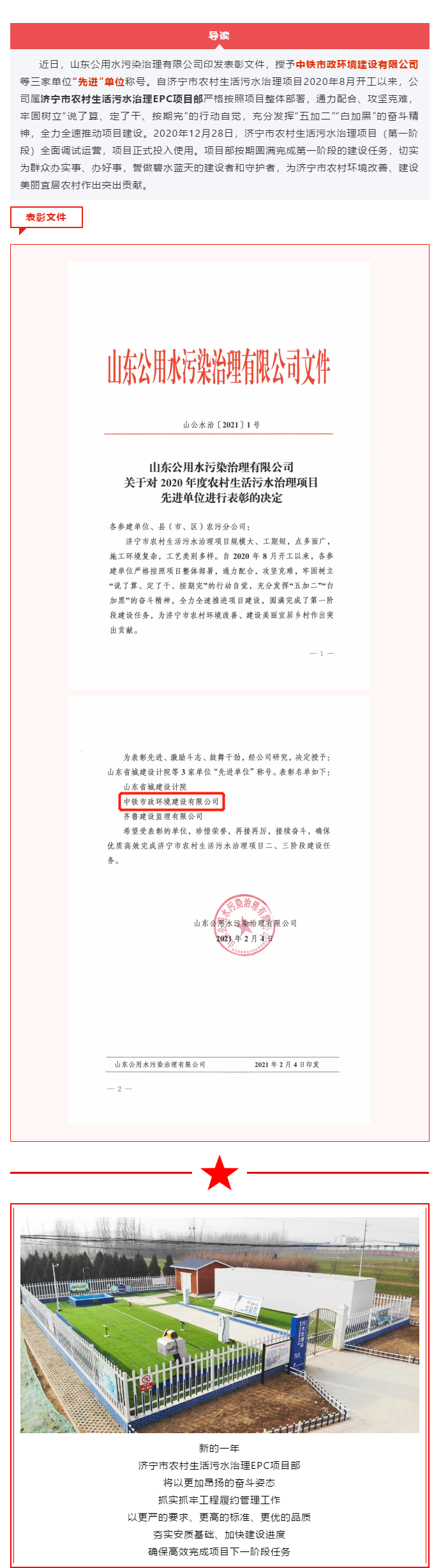 濟寧市農村生活污水治理EPC項目部再添新譽